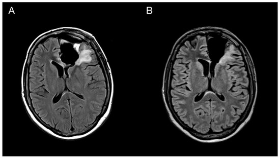 Imaging of the primary brain tumor prior to and after the oncological treatment. Axial brain MRI (fluid-attenuated inversion recovery images) prior to oncological treatment displaying GBM’s rapid early progression in the left frontal lobe (A) and two months after the chemo-radiotherapy (B).
