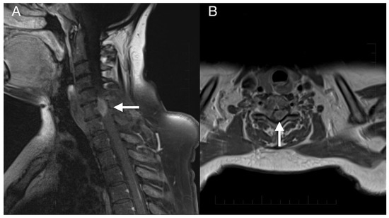 Imaging of the spinal metastasis. Five-month postoperative cervical spine MRI (postcontrast T1 weighted images) showing intradural expansion (arrow) at the C6 level intimately related to the spinal cord with spinal cord compression (A). Axial section showing intradural expansion (arrow) partially encircling the spinal cord and spreading into the neural foramen (B).