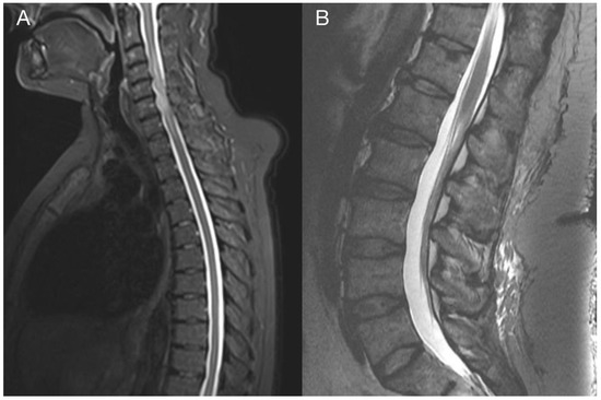 Imaging of the thoracic and lumbar spine. Preoperative MRI of the thoracic (A) and lumbar spine (B) did not show other pathological changes related to GBM metastasis.