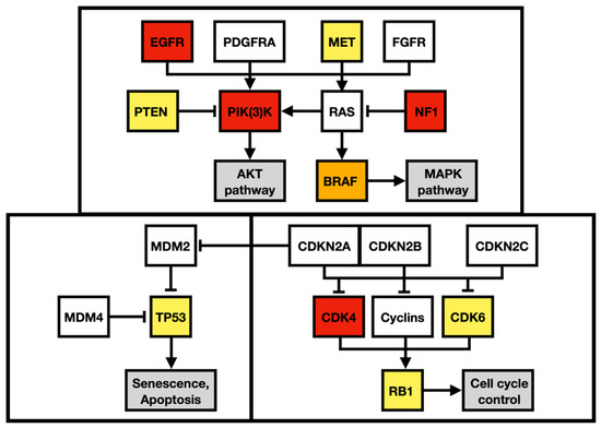 Apart from alteration in the p53 (apoptosis and senesce) and Rb pathways (cell-cycle progression), the described case harbored multiple gene alterations in the PI3K pathway, the main regulator of cell growth, survival, proliferation, invasion, and metastasis (Figure 9). A missense mutation in MET oncogene, the regulator of epithelial–mesenchymal transition, has been associated with elevated cell invasion, proliferation, and survival in atypical tissue environments. Furthermore, the MET gene was marked a signature gene of the mesenchymal molecular subtype [18,19].