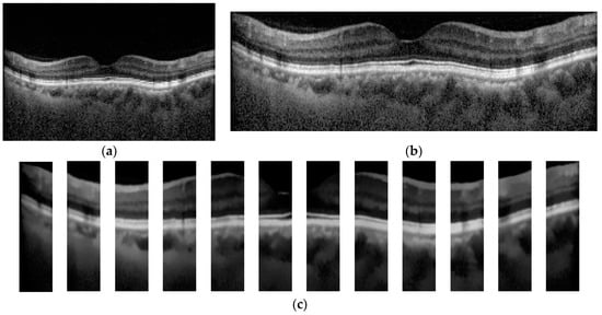 Example of original and preprocessed OCT image. (a) Original OCT, (b) Cropped OCT image, and (c) Denoised and subdivided OCT image.