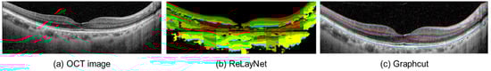 Example of the segmented OCT image (a) using RelayNet (b) and the graph-cut method (c).