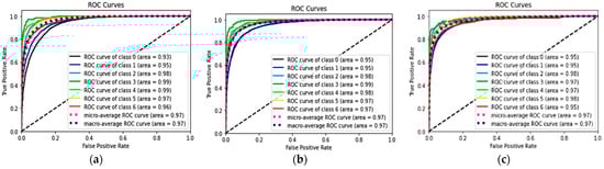 Table 2 shows the performances of seven classes using the three DL models and the p-values of the combined methods 1 and 2, compared with the classification alone method. The ROC curves and AUC of each ROC curve of the three models for the classification of each of the seven classes showed a similar AUC at 97%. The ROC curves of each class are shown in Figure 5.