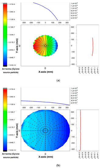 The calculated air kerma within the X-ray beam’s field of view of the modeled X-ray tube via the Monte Carlo simulation for the point detectors placed at a certain distance (75 mm) from the tube’s anode for two different tube voltages (60 kV and 120 kV) are shown in Figure 2a,b. As can be observed, the calculated air kerma on the right side of the field of view (toward the target) was less than the left side as a result of the heel effect phenomenon, while it remained almost uniform across from the top to the bottom. Moreover, by increasing the voltage, the air kerma increased as well.