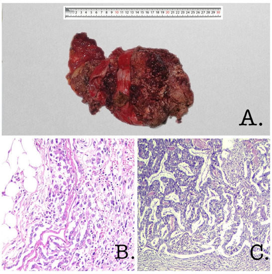 (A) Gross description: Nodular tumor with a size of 25/17/5 cm, irregular external surface, greyish-white color. Next to it, we identified a liver fragment with a size of 4.5/3/0.5 cm. The greater omentum was 14/8/1 cm in size, and the digestive tract segment was 3/3/1 cm. On section—mass with polypoid growth that was brittle, greyish-white, necrotic, protruding, and filling the entire lumen of the gallbladder. The tumor invaded the serosa of the gallbladder. Numerous yellow gallbladder stones were found inside the tumor, with hard consistency. (B) Hematoxylin and eosin ×200 (poorly cohesive cell carcinoma of the gallbladder): The histological study of the samples taken from the tumor showed the proliferation of carcinomatous cells with poorly cohesive cells and cord-like patterns forming a diffuse infiltrative growth invading the fat tissue. Neoplastic cells were round or oval, irregular in shape, with moderate cytonuclear atypia. The nuclei were vesicular and the nucleoli were eosinophilic and visible. The microscopic description suggested poorly cohesive cell carcinoma of the gallbladder. (C) Hematoxylin and eosin ×100 (intracholecystic papillary–tubular neoplasm of the gallbladder): The histological study of the samples taken from the neoplasm showed back-to-back epithelial units with a tubulopapilary growth pattern and limited stroma. The papillae were lined with cuboidal cells with eosinophilic cytoplasms that were enlarged, pleomorphic, and had atypical nuclei with distinct nucleoli; architectural complexity and a loss of polarity were also observed. The microscopic description suggested intracholecystic papillary–tubular neoplasm of the biliary type with high-grade dysplasia/carcinoma in situ.