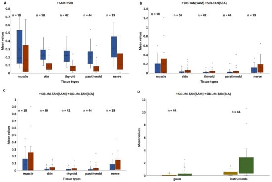 Averaged similarity values calculated for thyroid as reference versus muscle, nerve, parathyroid, thyroid, gauze, and instruments ((A) SAM and SID measures; (B) SID-TAN(SAM) and SID-TAN(SCA) measures; (C) SID-JM-TAN(SAM) and SID-JM-TAN(SCA) measures; (D) SID-JM-TAN(SAM) and SID-JM-TAN(SCA) for gauze and instruments against thyroid); n is the number of spectra.