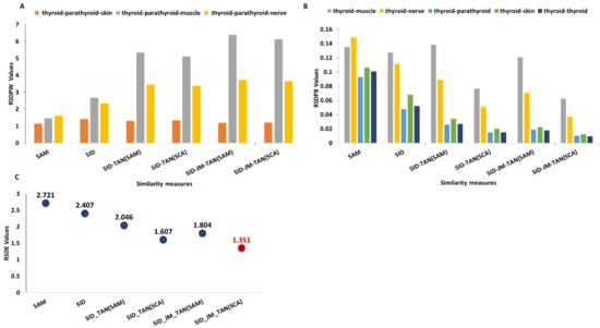 Figure 4A shows the RSDPW values calculated between two similar tissues, thyroid and parathyroid, and a third one. The RSDPW values obtained with SID-JM-TAN(SAM) and SID-JM-TAN (SCA) were relatively higher than the RSDPW values obtained with other measures. A higher value of RSDPW shows the better discriminatory power of a measure. Comparing RSDPWSID-JM-TAN(SCA)(thyroid-parathyroid-nerve) = 3.66, RSDPWSID-JM-TAN(SCA) (thyroid-parathyroid-muscle) = 6.12, and RSDPWSID-JM-TAN(SCA) (thyroid- parathyroid-skin) = 1.21 implies that the signatures of nerve, muscle, and skin are dissimilar. The results indicate that the SID-JM-TAN(SAM) and SID-JM-TAN(SCA) measures are suitable for tissue discrimination.