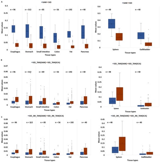 Averaged similarity values calculated by different methods to compare colon tissue with other tissues (e.g., esophagus, stomach, small intestine, colon, fat, pancreas, gallbladder, and spleen) ((A) SAM and SID measures; (B) SID-TAN(SAM) and SID-TAN(SCA); (C) SID-JM-TAN(SAM) and SID-JM-TAN(SCA)).