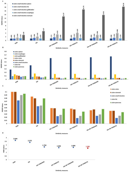 (A) RSDPW produced by different similarity measures. (B) RSDPB values calculated by different similarity measures. (C) RSDPB values produced by the small intestine, colon, fat, pancreas, and stomach. (D) RSDE values produced by different similarity measures (reference tissue: colon).