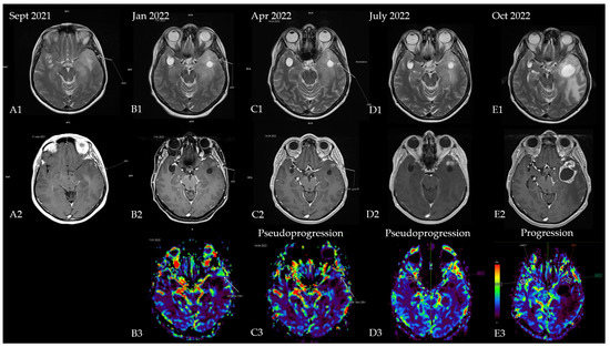 Patient’s disease progression showcased through serial brain MRI imaging. (A) Brain MRI at diagnosis ((A1)—T2 sequence showing diffuse hypersignal in the left temporal lobe; (A2)—T1 + contrast showing a slight nodular enhancement located in the anterior part of the temporal); (B) brain MRI after completion of the first PCV cycle ((B1)—T2 sequence with nodular hypersignal with CSF-like signal from the biopsy site; (B2)—T1 + contrast showing a slight increase in the size of the contrast-enhancing nodule; (B3)—postprocessing rCBV (relative cerebral blood volume) image showing hyperperfusion within the left temporal lobe). Results of the NGS testing corrected the initial diagnosis, and chemoradiotherapy was initiated. (C) Brain MRI 4 weeks after chemoradiotherapy ((C1)—T2 sequence showing mild reduction of the hypersignal; (C2)—T1 + contrast showing a nodular lesion with ring-shaped contrast enhancement with intralesional necrosis; (C3)—rCBV postprocessing showing reduction in perfusion in the enhancing area); (D) brain MRI showing pseudo-progression (3 months after starting TMZ and 4 months after completion of radiotherapy) ((D1)—T2 sequence showing mild reduction of the hypersignal; (D2)—T1 + contrast showing 2 nodular lesions with contrast enhancement; (D3)—rCBV postprocessing showing complete decrease in perfusion in the enhancing area); (E) brain MRI from October 2022 (1 month after she finished 6 cycles of TMZ and 7 months after radiotherapy completion) showing disease progression ((E1)—T2 sequence showing enhanced hypersignal and significant mass effect of a new lesion in the anterior temporal lobe with perilesional edema; (E2)—T1 + contrast showing a cystic lesion with ring-shaped contrast enhancement with intralesional necrosis and new extension within the anterior part of the temporal lobe; (E3)—rCBV postprocessing heatmap showing no apparent signs of hyperperfusion).