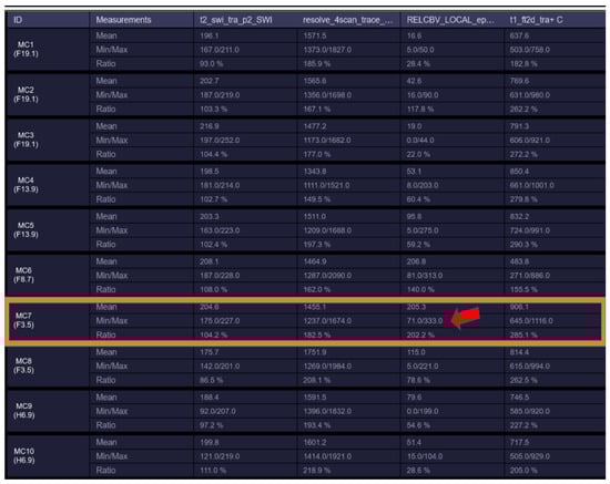 rCBV hyperperfusion indicating neoangiogenesis (MC7—showing rCBV > 1.7–1.9 threshold for neo-angiogenesis).