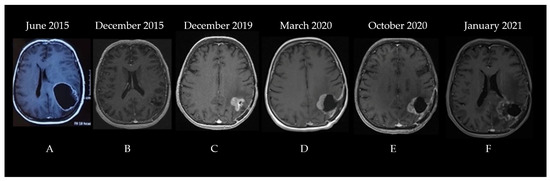 The patient’s disease progression showcased through serial brain MRI imaging ((A)—left frontoparietal process with a heterogeneous signal and structure, irregular margins, and both solid and cystic components surrounded by moderate edema, which compressed and tractioned the trigon and body of the left lateral ventricle upward, (B)—left parietal postoperative cavity with discrete wall contrast enhancement, minimal traction over the occipital horn of the left lateral ventricle, and midline structures in normal position, (C)—vascularized tumoral tissue on the medial and superior wall of the postsurgical resection cavity with perilesional edema, (D)—postoperative cavity and residual tumor after second surgery, (E)—postoperative cavity after second surgery with progression of residual tumor, (F)—further progression of residual tumor coupled with radiation induced changes).