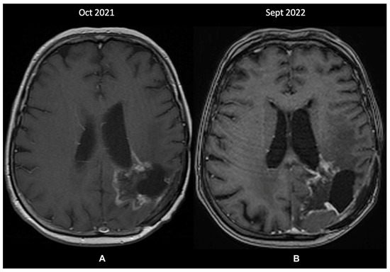 A re-evaluation brain MRI (October 2021—Figure 4A) identified further changes within the left parietal lobe that were suggestive of recurrence and radiation-induced necrosis. These measured 43/44 mm, extended medially from the postoperative cavity, and entirely circumscribed the subependymal space adjacent to the posterior horn of the left ventricle. Because the images showed structural progression of the contrast-enhancing lesions, without the possibility of undergoing a further biopsy, the patient was prescribed metronomic TMZ (50 mg/m2 daily). Since then, the disease has been clinically stable, and the last MRI in September 2022 showed minimal changes. Treatment was administered without any toxicity issues and was only interrupted for a brief period (two weeks) due to COVID-19 infection. However, compared to the previous MRI 11 months prior, a probable recurrence was visible in the posterior part of the cystic cavity (Figure 4B).