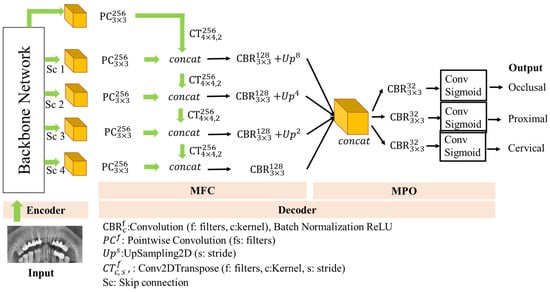 The MPO block divided the final feature map into three paths, as shown in Figure 2. Each path represents one type of caries. Here, the final feature map, like Unet and FPN, were not used directly. The main reason for this is to prevent the interaction of caries types that are very closely related to each other. Thus, it detects with higher scores than other single-output architectures.