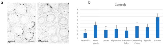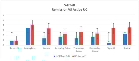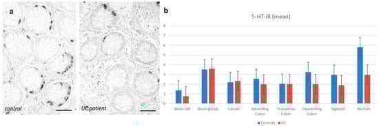 In our study, the decrease in the number of 5HT-iR cells in UC patients compared to healthy controls has been reported, and this reduction is significant in the rectum (p < 0.05).
