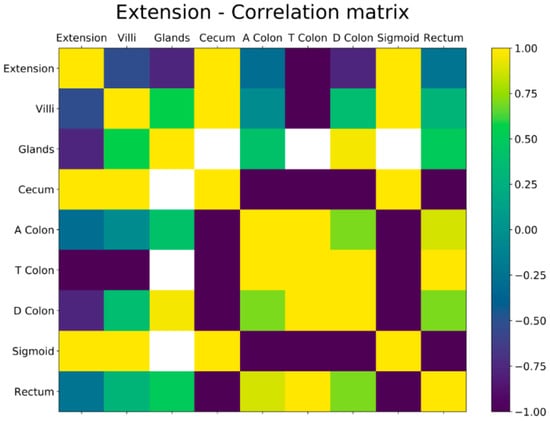 A negative correlation was found between 5-HT-iR and the extension of the disease. This negative correlation was found in all the investigated ileal and colonic tracts but particularly for the localization “ileum” (rho = −0.756) and “descending colon” (rho = 0.758). More concretely, a high positive Pearson coefficient indicates a variable for which a higher value corresponds to a higher extension of the disease. Conversely, a high negative Pearson coefficient is found for a variable for which a higher value corresponds to a lower extension of the disease. In our data in the patients affected by UC, a higher concentration of 5-HT-iR corresponds to a lower extension of the disease, while a lower concentration of 5-HT-iR corresponds to a higher extension of the disease (Figure 4).