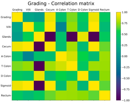 Correlation between the concentration of 5-HT-iR and the grading of the disease with Pearson’s coefficient.