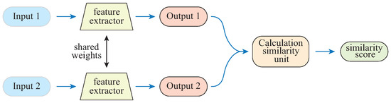 As illustrated in Figure 2, the training Siamese network needs to input paired samples and optimize the model parameters by minimizing the loss function. In the settings of this section, the similarity is measured by the distance (Equation (2)), so when minimizing the loss function (Equation (3)), the distance between paired samples from the same category should be small, and the distance between paired samples from different categories should be large.