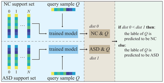 In the test phase, the test dataset is divided into a support set and a query set. Suppose that there are C categories in the data set and N samples in the support set of each category. This few-shot learning classification task is called a C-way N-shot task. Figure 3 shows the test flowchart of the trained Siamese network model. In our case, we have two categories (NC and ASD), so it is a two-way N-shot task. Given a query sample Q from the query set, each support set has N support samples. The distances/similarities between the query sample Q and the samples in the two support sets are calculated to predict the label of sample Q.