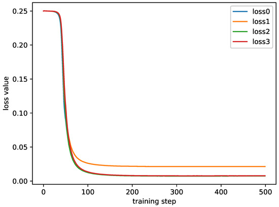 It can be seen from Figure 5 that, after the training step is about 100, the loss value tends to be stable. This shows that the proposed method can converge rapidly. In addition, the trends of the four curves are similar, and there is no huge difference in the loss value. Except for one curve, the other three curves are almost coincidental. This shows that the model is not overfitted to the particular training station and is balanced on multiple training sites.