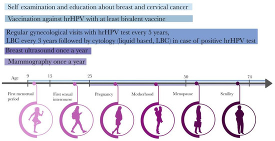 For CC, the main incident factor is known and there are tests based on ASSURED principles (by World Health Organization) to ensure early detection of high-risk human papillomavirus (hrHPV) infection [13,14]. It is reasonable to suppose that approximately 20 percent of women aged 14 to 19 in countries with a high human development index (HDI) are infected with one of the types of HPV [15]. For comparison, cases of genetically determined BC constitute only about 5% of cases; however, the call for predisposition tests is similar to that of preventive vaccinations in the case of HPV [16]. The remaining risk factors for BC are largely modifiable [17]. While in many countries for average-risk women, risk factor control as primary prevention and cyclic mammography (MMG) for women >45 years of age as secondary BC prevention, and risk factors control (together with hrHPV vaccination) and cyclic liquid-based cytology (LBC) for CC prevention are available and recommended [18], insufficient emphasis is put on reaching this population, which constitutes more than half of the female population in these countries. The latter can be seen in the Polish population where the proportion of people participating in screening is declining (see Supplementary Material S1) [19].