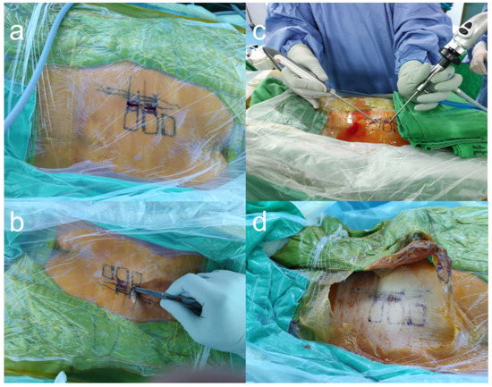 The entry points and working channels of biportal endoscopic radiofrequency ablation. (a) Under fluoroscope, the S1–S3 foramina were marked on the skin. (b) Two incisions were made, one near the S1 foramen and another near the S2 foramen. (c) One foramen was for the endoscopic channel, and the other was for the insertion of the ablation wand. (d) Sutured wound after the surgery.