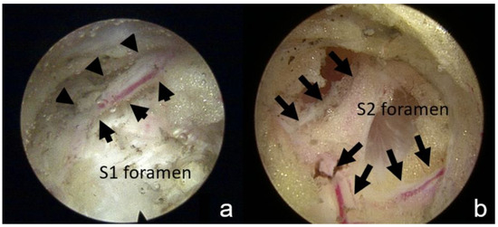 Foramen and sensory nerve under endoscopic view. (a) This endoscopic view demonstrates the S2 foramen and the exiting sensory nerve (arrow). (b) The sensory nerve is usually accompanied by blood vessels.
