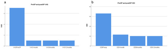 Due to smaller patient sample, we used nonparametric statistics. The Wilcoxon signed rank test was used to compare preoperative and postoperative VAS and ODI scores. Statistical significance was set to p ≤ 0.05. Statistical analyses were performed and graphs were designed using SPSS version 25 (IBM Corp. (ICC/POK), USA 2017).
