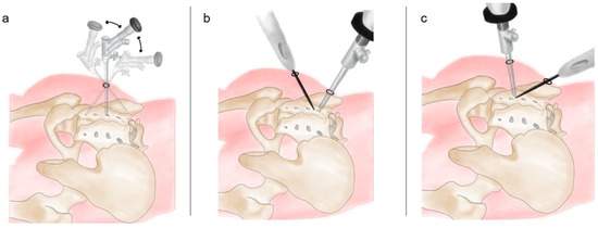 Biportal endoscopy allowed us to improve the working angle by switching the viewing endoscope and the ablation wand. (a) Single-port endoscopy has a limited working angle that restricts operating at the S3 lateral branch and L5 dorsal ramus. (b,c) Biportal endoscopy afforded a more flexible working space by allowing us to exchange the viewing endoscope and the ablation wand.