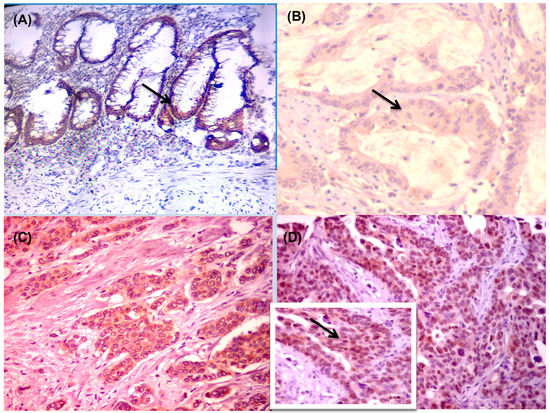 BRAF protein expression was recorded in 25 cases (39.1%) in the current study with significant association with the advanced grade, lymph node state, Dukes staging, and the occurrence of relapse and short OS. From these results, we concluded that BRAF protein expression in CRC is a poor prognostic marker. These findings agree with the previous studies’ results in which the authors explored the BRAF gene and protein expressions, and found that these expressions were associated with poor prognostic parameters, including the advanced grade and T stage of the tumor, and short OS in the case of protein expression [24,41]. Our findings support the previous studies, which report the significant implication of BRAF in cancer and associate right-sided colon cancer with worse clinical outcomes. BRAF protein is a valuable biomarker for identifying patients who may benefit from a more individualized course of therapy [24,42]. We noticed occasional cytoplasmic and nuclear immunostaining for BRAF in normal mucosa cells (Figure 2). These findings should be interpreted with caution, as incomplete specificity of the anti-BRAF polyclonal antibodies used in the current work and the potential cross-reactivity with other epitopes could play part in this finding, and warrant further confirmatory studies that apply more specific monoclonal antibodies to differentiate mutant vs. wild BRAF protein.