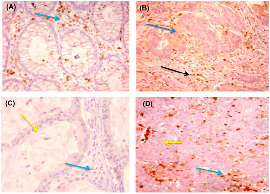 Immunohistochemical staining of colonic adenocarcinoma for PD1. Adjacent non-neoplastic colonic mucosa showed positive staining of the mucosal lymphocytes for PD1 ((A) ×400), G1 adenocarcinoma showed positive staining of intratumoral immune cells for PD1 (blue arrow) with no expression in tumor cells (yellow arrow) ((B) × 200 and (C) × 400). In addition, G3 adenocarcinoma showed expression of PD1 on intratumoral immune cells (blue arrow) with negative expressions on tumor cells (yellow arrow) ((D) × 400). N.B., as the lymphocytes have little cytoplasm, the staining appears mainly cytoplasmic.