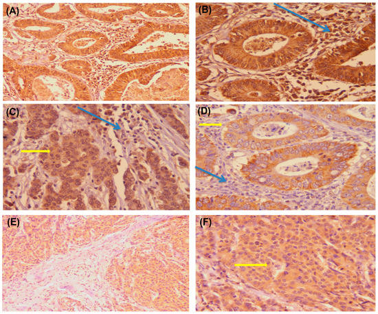 Immunohistochemical staining of colonic adenocarcinoma for PDL1. Positive expressions of PDL1 on tumor cells (yellow arrow) and intertumoral lymphocytes in G1 colonic adenocarcinoma (blue arrow) were observed ((A) ×200 and (B) × 400). G2 adenocarcinoma showed moderate expression of PDL1 on intratumor immune cells (blue arrow) and tumor cells (yellow arrow) (C) × 400). The expression is mainly cytoplasmic; however, in the photo ((D) × 400), the expression of PDL1 in tumor cells was mainly membranous (yellow arrow) with no expression on intratumor immune cells (blue arrow). In addition, G3 adenocarcinoma showed moderate expression of PDL1 on tumor cells (yellow arrow in panel (F)) ((E) × 200 and (F) × 400).