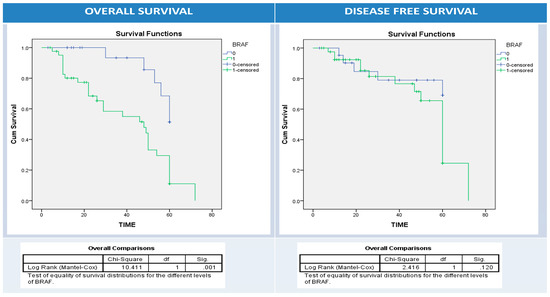 Kaplan–Meier survival curves for overall (right panel) and disease-free survival (left panel) according to BRAF expression (0: blue (-ve BRAF), 1: green (BRAF overexpression)). Log Rank test (Mantel–Cox) was used.