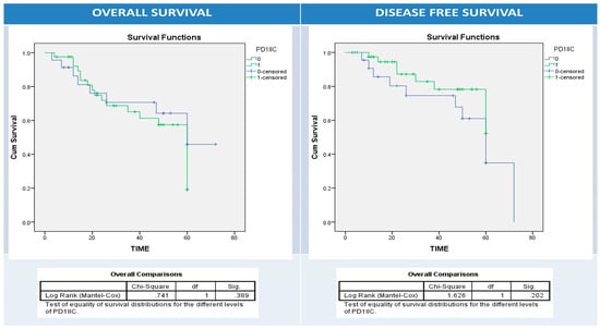 Kaplan–Meier survival curves for overall (right panel) and disease-free survival (left panel) according to IIC PD1 expression (0: blue (-ve PD1 IIC); 1: green (+ve PD1 IIC)). Log Rank test (Mantel–Cox) was used.