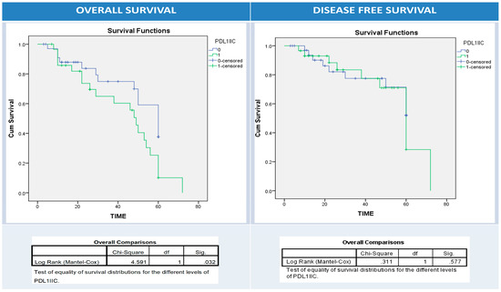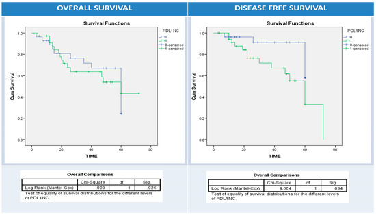 Kaplan–Meier survival curves for overall (right panel) and disease-free survival (left panel) according to neoplastic cells (NC) PDL1 expression (0: blue (-ve PDL1 NC); 1: green (+ve PDL1 NC)). Log Rank test (Mantel–Cox) was used.