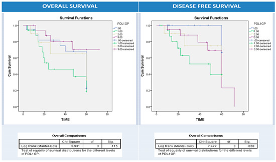 Kaplan–Meier survival curves for overall (right panel) and disease-free survival (left panel) according to combined PDL1 expression pattern (NC−IIC). 0: blue (NC−IIC−); 1.00: green (NC+ IIC); 2.00: yellow (NC−IIC+); 3: purple (NC+IIC+). Log Rank test (Mantel–Cox) was used.