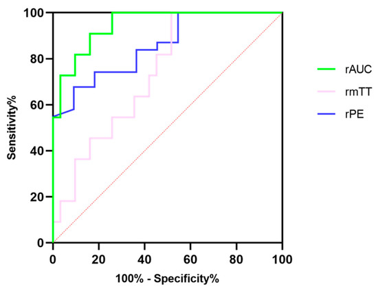Dynamic contrast-enhanced ultrasound analysis based on transabdominal scans was an easier method to assess the microcirculation of pancreatic lesions and it was beneficial in monitoring the treatment response in locally advanced pancreatic tumors, according to our own prior research [27,28]. Overall, the DCE-US analysis and quantitative parameters showed a satisfactory performance for predicting the pathological grades of pNETs in our study; the pNETs G1/G2 had significantly higher rPE, rmTT, and rAUC values than pNETs G3/pNECs, indicating that the internal contrast agent in pNETs G3/pNECs lesions washed out more quickly than that of pNETs G1/G2 lesions. According to previous studies, the AUC values and PE values were parameters related to the hemodynamics of ROI on DCE-US [32,37].As well as being correlated to the degree of vascularization and density of the vascular network, fast flow and low tissue vascular resistance were available in high AUC values [38]. Compared with pNETs G3/pNECs, the higher rPE and rAUC in pNETs G1/G2 were the results of the relatively higher microvessel density (MVD) but lower fibrotic components, as already reported in several studies [39,40,41,42,43]. Hence, the rAUC and rPE were promising factors for predicting pathological grades of pNETs by evaluating microvessel perfusion quantitatively. In addition, the mTT was also a promising parameter correlated to both hemodynamics and vascular morphology [37]. Anant et al. reported that increased mean values of mTT after neoadjuvant chemotherapy were helpful to assess the response in breast cancer by the change in tumor vascularity, with an accuracy of 86.7% [44]. However, the rmTT had a lower diagnostic performance, a wider confidence interval and lower bounds of the confidence interval compared with rPE and rAUC in our study. As for our study, the metric of CUI values including CUI+ and CUI− were used for evaluating the diagnosis accuracy of predicting pNETs G3/pNECs and pNETs G1/G2. The CUI+ value of 0.61 and CUI− value of 0.82 in rAUC supported fair utility and good utility in clinical practice of predicting pNETs G3/pNECs.