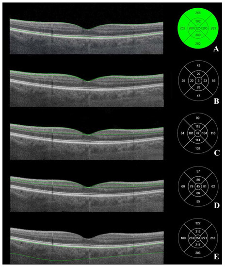 Macular OCT. Macular layers marked on the right. (A) the total thickness of the macula, (B) retinal nerve fiber layer (from internal limiting membrane to the interface between retinal nerve fiber layer and ganglion cell layer), (C) GCL++ layer (from internal limiting membrane to the interface between inner plexiform layer), (D) GCL+ layer (from the interface between retinal nerve fiber layer and ganglion cell layer to the interface between inner plexiform layer and inner nuclear layer). (E) choroid thickness (from retinal pigment epithelium to the interface between choroid and sclera). Left—ETDRS–9 segments and thickness of the measured layer (µm). (Images were acquired with DRI OCT Triton plus (Ver.10.13). Final image was finished using ImageJ program and Clip Studio Paint PRO program Ver. 1.9.10 ©CELSYS Inc. https://www.clipstudio.net/en/).
