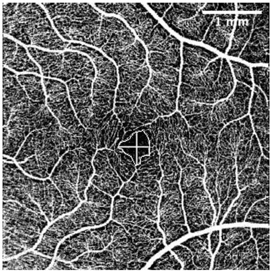 - Shiihara, H.; Terasaki, H.; Sonoda, S.; Kakiuchi, N.; Shinohara, Y.; Tomita, M.; Sakamoto, T. Objective evaluation of size and shape of superficial foveal avascular zone in normal subjects by optical coherence tomography angiography. Sci. Rep. 2018, 8, 10143. [Google Scholar] [CrossRef] [PubMed]