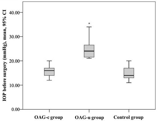 IOP before cataract surgery did not differ between the control group and the OAGc group (p = 0.322), but it was statistically significantly lower than in the OAGu group (p < 0.001). Even though IOP did not differ between the control group and the OAGc group, a tendency of lower IOP was found in the control group. IOP in the OAGc group was statistically significantly lower than in the OAGu group (p < 0.001) (Figure 3).