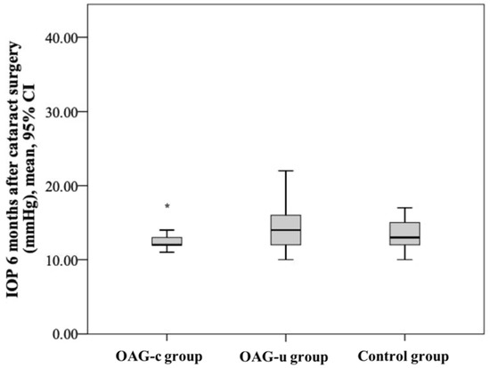IOP 6 months after cataract surgery in all groups. Asterisk (*) marks statistically significantly lower IOP in the OAGc group than in the OAGu group (p < 0.001).
