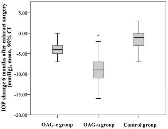 IOP change 6 months after cataract surgery in all groups. The highest negative IOP change was found in the OAGu group (*) (p = 0.018).