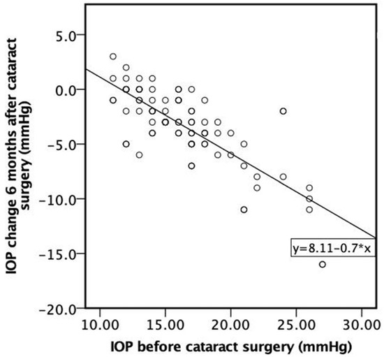Correlation between IOP before cataract surgery and IOP change 6 months after cataract surgery.