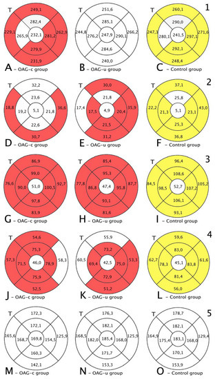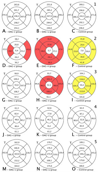 The total thickness of the macula increased in all subsegments in OAGc and control groups, while in the OAGu group an increase in the total macula thickness was found only in the inner superior, inner inferior, outer temporal, and outer nasal subsegments (Figure 9, first row).