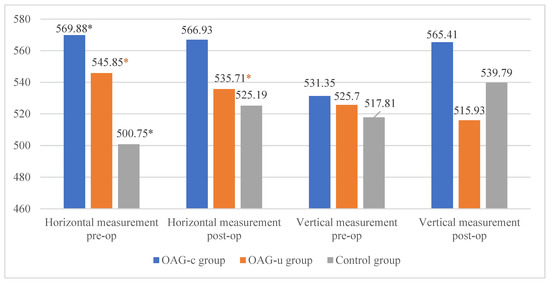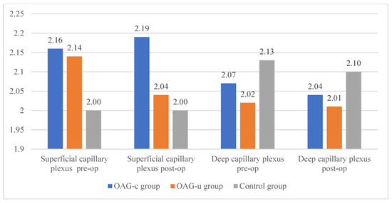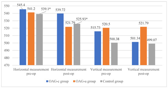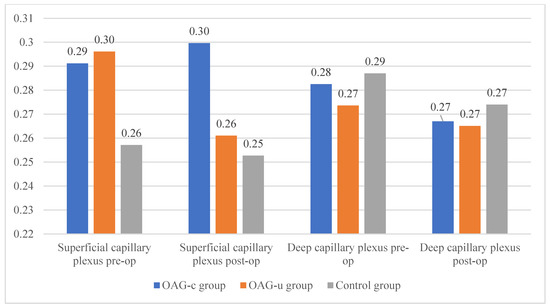 The horizontal measurement of the superficial capillary plexus before cataract surgery was statistically significantly higher in the OAGc group compared to the control group (p = 0.009). In the OAGu group the horizontal measurement before the surgery was statistically significantly higher than 6 months after surgery (p = 0.030). The vertical measurement before the surgery did not differ statistically significantly in all groups (p > 0.05). In the OAGc group the vertical measurement was statistically significantly lower after the surgery than before the surgery (p = 0.008) (Figure 12).