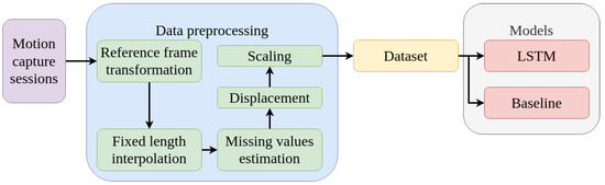 This Section focuses on depicting the processes of data acquisition and preprocessing, as well as the models to be compared. The pipeline’s various steps are depicted in Figure 1. Firstly, the data are acquired from motion capture sessions. Secondly, five preprocessing steps are applied to the data. Thirdly, the preprocessed data are used to generate the dataset. Lastly, the dataset is used to compute, train, and evaluate the models.