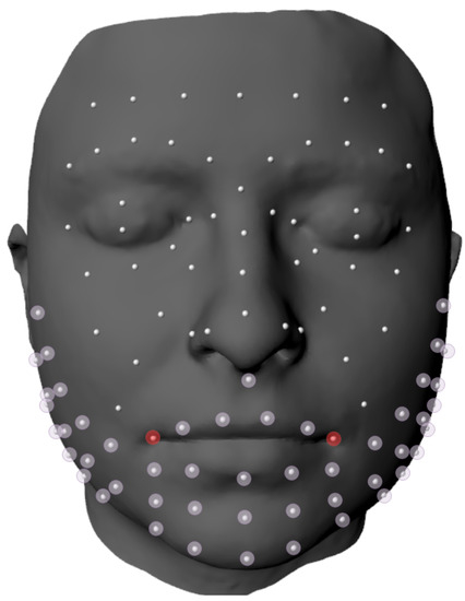 Set of markers virtually placed on a 3D model of the face. The selected markers appear highlighted in violet and red (commissure markers).