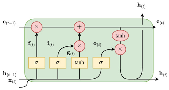 The LSTM cell [54], displayed in Figure 4, is defined as follows: