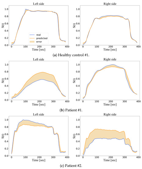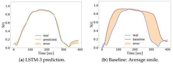 In short, we have addressed a facial movement assessment problem as a non-linear optimization task rather than a classification task [57] to avoid a certain level of subjectivity, ex. the classes being defined by the grades of the House–Brackmann system. Furthermore, an anomaly detector is able to precisely track the degree of anomaly of a patient during follow-up which is expected to decrease over time if the rehabilition is successful. As stated in [52], LSTM models outperform other machine learning algorithms when sequential data is involved in anomaly detection tasks. On the one hand, the LSTM model is trained to minimize the degree of anomaly when evaluating the healthy smiles on the training dataset. Thus, its predictions are adapted to fit healthy smiles (Figure 6) and flag up a higher degree of anomalies for the patients’ smiles. On the other hand, the baseline computes a single smile as the average of the training dataset. Hence, its assessment relies on a reference smile which does not fit other healthy smiles. Consequently, we consider that the LSTM’s evaluations outperform those of the statistical model commonly used in the literature. Figure 7 illustrates an example where the LSTM’s prediction is well adapted to evaluate healthy smiles whereas the baseline is not. Nonetheless, we consider that further investigation on LSTM variants, such as LSTM auto-encoders [58], should be carried out to exploit sequential data collected by motion capture system which might contain some null values.