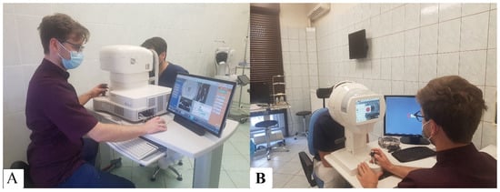 Figure presenting the measurement made with the compared devices. (A)—OCT Cassia 2. (B)—GalileiG6 Dual Scheimpflug Analyzer.
